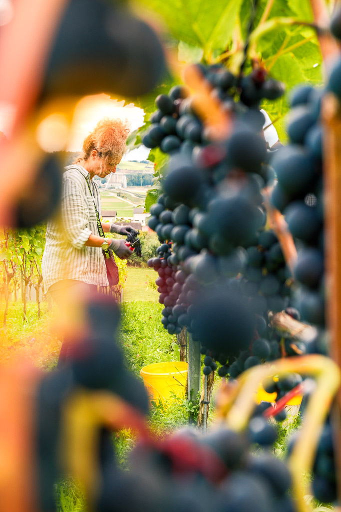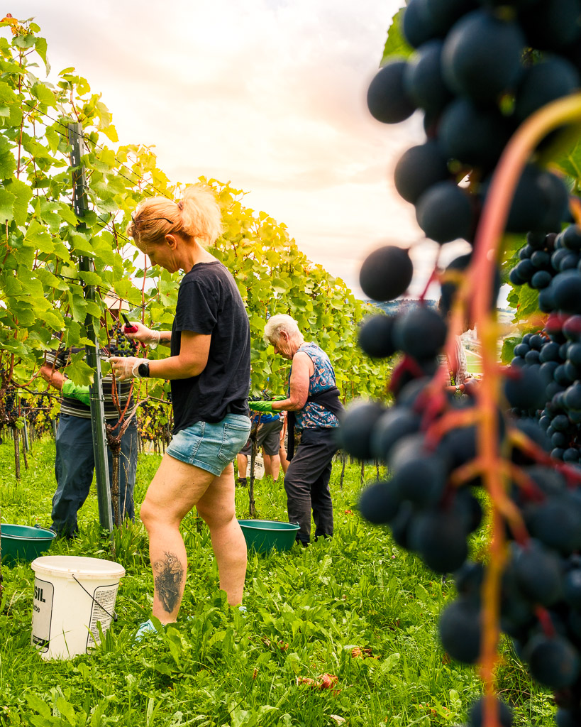 Nach kurzer Einweisung füllen wir unsere Eimer mit Trauben, welche wir vorher sorgfältig mit Schere und von Hand verlesen. Kesselträger sorgen für immer wieder leere Eimer und füllen die grossen Bottiche. Diese transportieren wir am Ende des Tages in den Weinkeller. Dazwischen machen wir immer wieder Pausen, um Energie zu tanken.